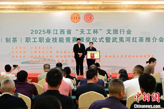 圖為江西省“天工杯”文旅行業(yè)(制茶)職工職業(yè)技能競(jìng)賽頒獎(jiǎng)儀式,楊柳(右)榮獲本次競(jìng)賽一等獎(jiǎng)。占俊玲 攝